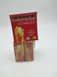 10 Christbaumanhänger im Weihnachtsdesign mit Milchschokoladen und süßen weißen Schokotäfelchen zum Vernaschen. Fix und fertig zum Dekorieren mit Goldbändern verpackt.